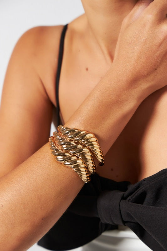 18k gold plated curved bracelet. Length 20cm, diameter 6,5cm and width 1,8cm.