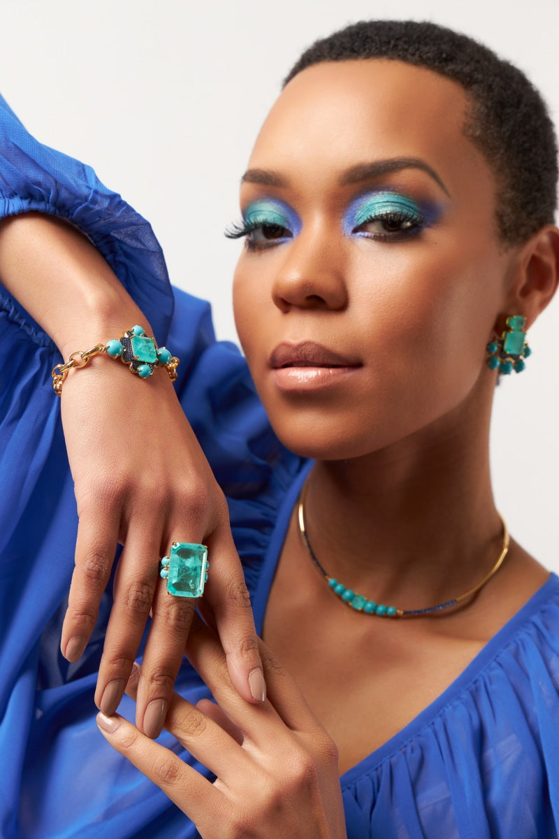 18k gold plated bracelet made with square shaped fusion tourmaline crystals, dark zirconias and turquoise cabochons. Length 17 cm.